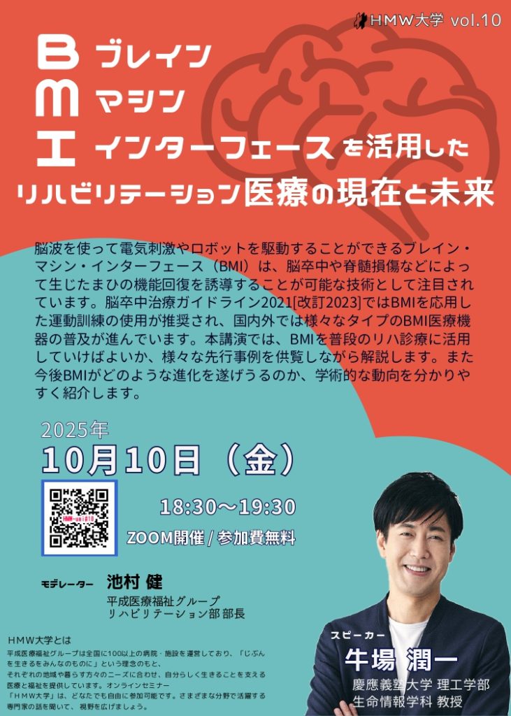 「ブレイン・マシン・インターフェース(BMI)を活用したリハビリテーション医療の現在と未来」 - 日 時:2025年10月10日(金)18:15 開室/18:30 開始/19:30 終了