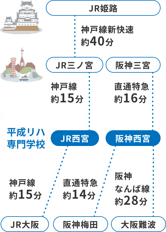大阪と神戸のちょうど中間に位置する西宮にあります。近くに大学がたくさんある学生の町です。学生用マンションなどもたくさんありますので、遠方の方でも安心してお越しいただけます。
