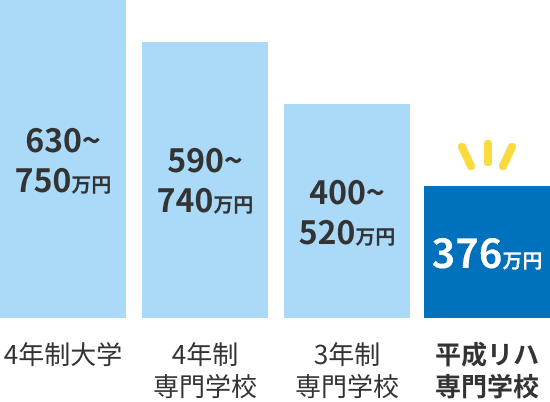 一般的な4年制大学の学費が平均630万円〜750万円であるのに対し、専門学校(4年制)では590万円〜740万円、3年制では400万円〜520万円が目安です。